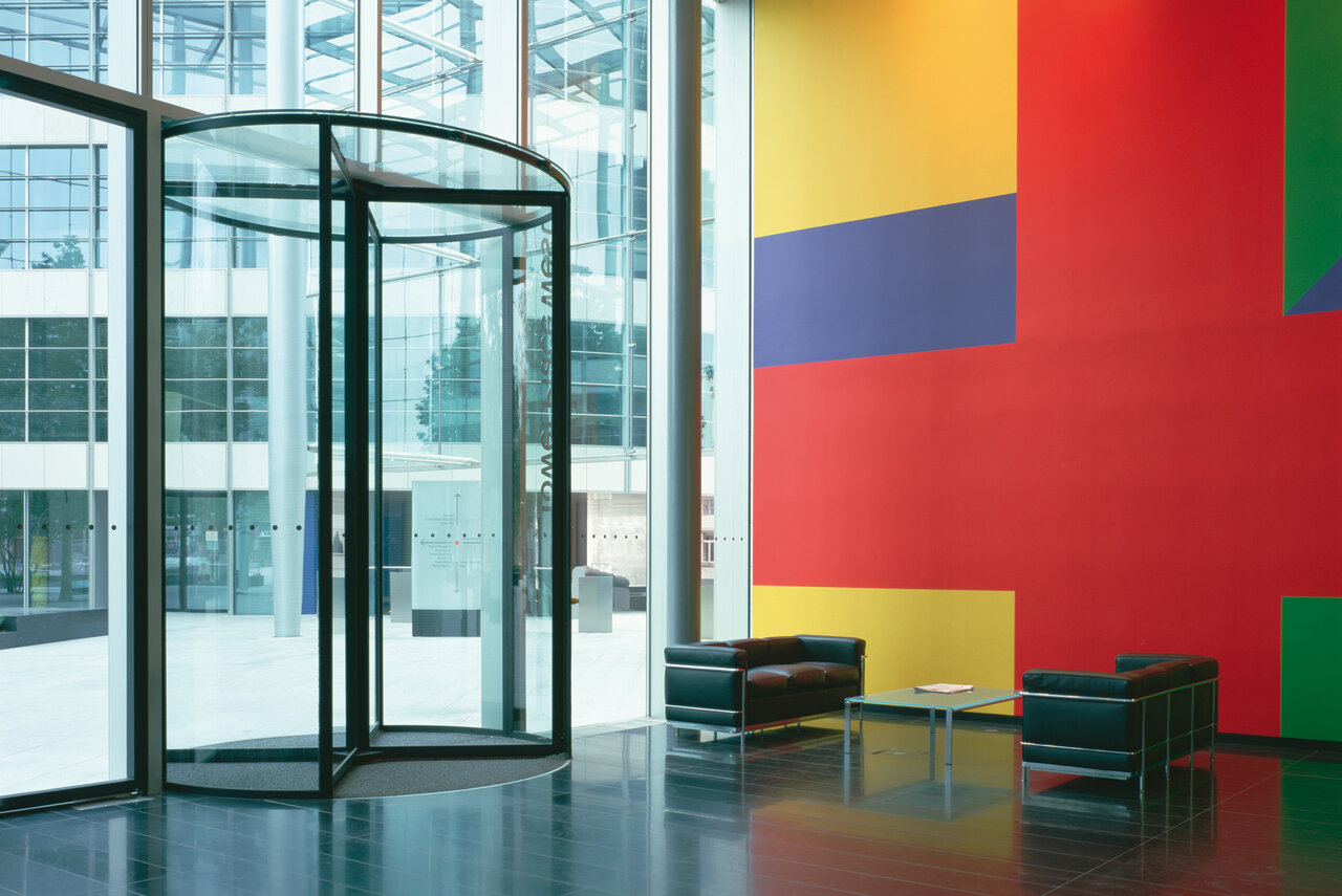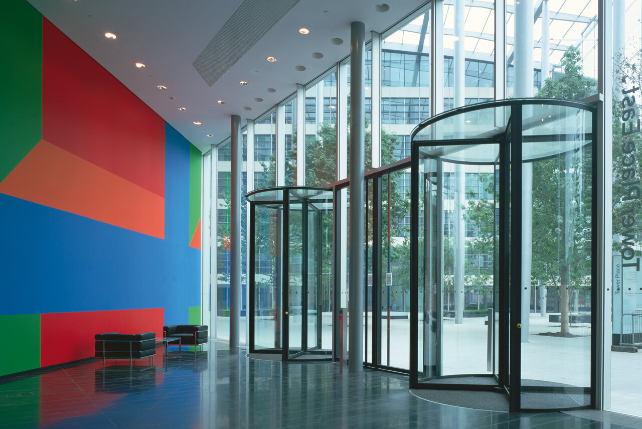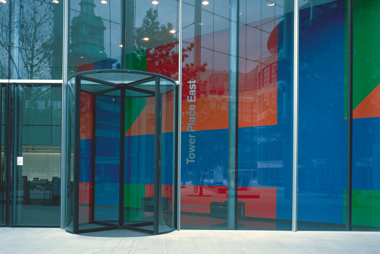 The east entrance at Tower Place in london was designed by architects Foster and Partners. This installtion is a fully automatic record K41 four wing revolving door and has an all-glass drum with visible parts anodised. The operating drive for this revolving door is concealed beneath the floor in a casing which protects it from water and dirt.