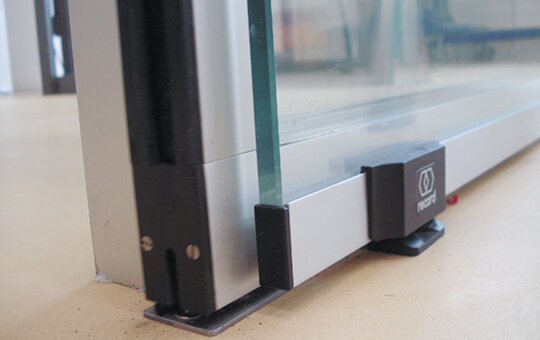 Regardless of the glass used in the door, protective screens are fitted with 10 mm toughened safety glass (ESG), and normally have frames on two sides only. On each side, bearing points are located at the floor and on the header profile. To allow unimpeded access for cleaning or maintenance, the protective wings are designed to swivel. A specially designed sliding lock located on the floor fixes the protective screen in place. Both its shape and the unlocking process itself have been consciously designed to inhibit manipulation sufficiently, for example by playing children, in contrast with more common mechanisms. Locking occurs in the usual way, however, and happens by merely closing the protective screens, and requires no further intervention.