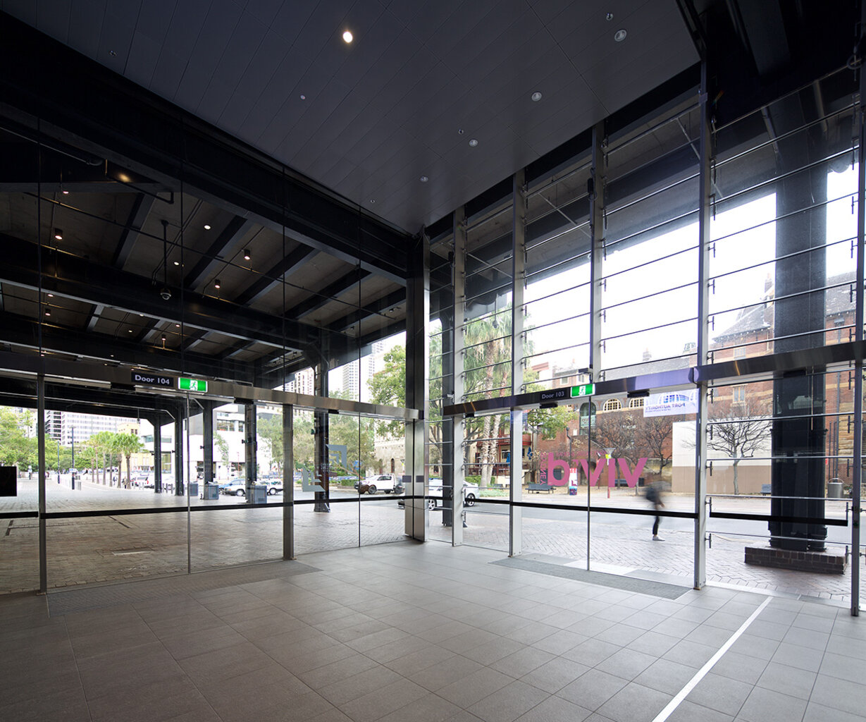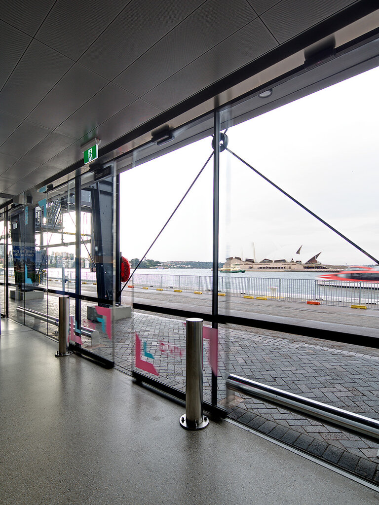 To help Sydney safely accommodate the ever increasing demand from some of the world’s largest cruise ships, an extensive renovation was undertaken to the existing Overseas Passenger Terminal in Circular Quay. Part of the design brief was a requirement for large frameless glass sliding doors to three of the building’s elevations to facilitate not only normal passenger movement, but also emergency egress requirements.