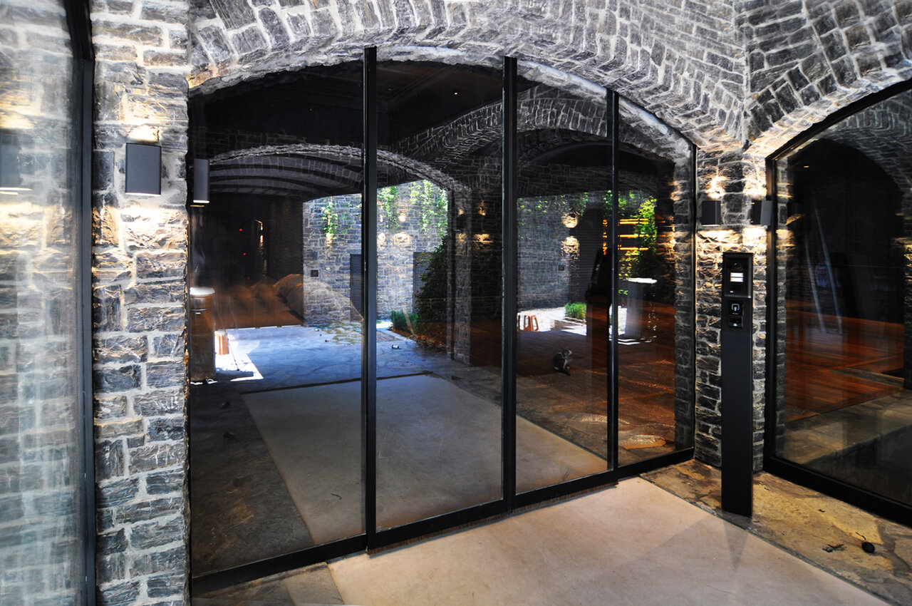 Automatic sliding doors record STA-20 installed by the entrance to the kitchen and to the gym. To emphasize the architecture of the stone wall by the main entrance, the operator record STA-20 was mounted between the wall and the ceiling.