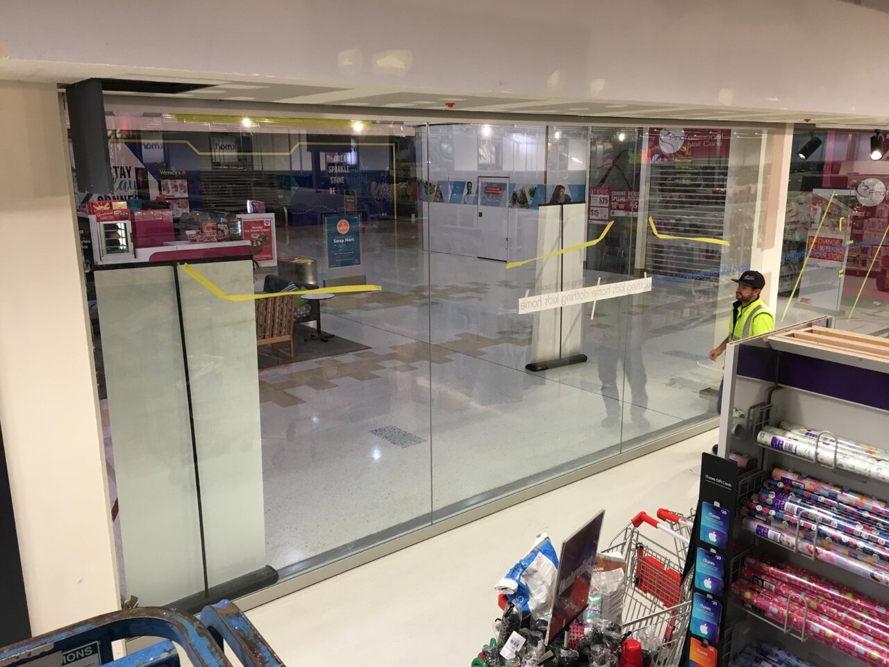 The single sliding door is 6350mm wide and 3000mm high with continuous top and bottom rails supporting 3 panels of toughened glass with silicon butt joints.